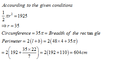 $ \begin{array}{l}2\pi r+4a=272\\\Rightarrow a=\frac{1}{4}\left( 272-176 \right)\\=\frac{1}{4}\times 96cm=24cm\\Sum\text{ }of\text{ }the\text{ }area=\pi {{r}^{2}}+{{a}^{2}}=2464+576=3040\end{array}$
