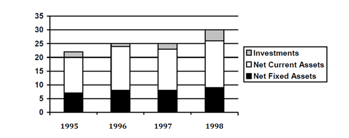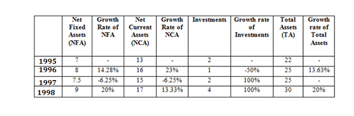 From the table we can see that the growth rate between 1995-98 of total assets = (30-22)/22 = 36%. But this is over a 3 year period. Average annual growth rate = 36/3 = 12%.