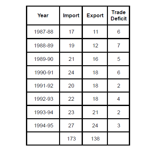 From the table we can conclude that trade deficit is more than the trade deficit in the succeeding years in 1988-89, 1990-91, 1992 -93 i.e.for 3 years.