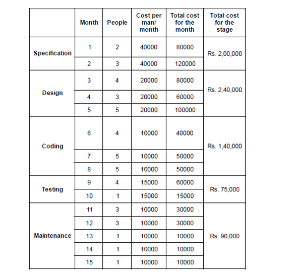 After combining these months we find that the total cost incurred in the coding stage = (5 + 5 + 4) × 10000 = Rs.1,40,000.