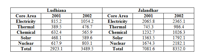 The amount of money invested (rupees in crores) in the core infrastructure areas of two districts, Ludhiana and Jalandhar in Punjab, is as follows.