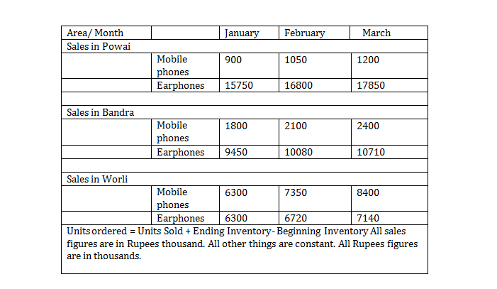 In a month of February, 1050 units of Mobile phones and 2400 unitsof Earphones were sold in all 3 areas.