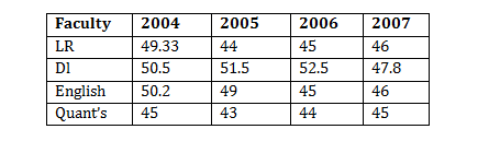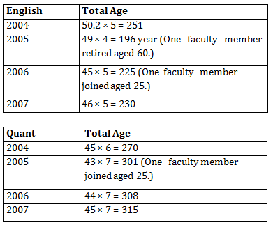 Space Institute which is involved in training and helping students prepare for Management Institute Entrance Exams, was established on January 1, 2004 with 3, 4, 5 and 6 faculty members in the Logical Reasoning (LR), Data Interpretation (Dl), English Language and Quantitative Analysis (QA) areas respectively, to start with. No faculty member retired or joined the institute in the first three months, of the year 2004. In the next four years, the institute recruited faculty members in each of the four areas. All these new faculty members who joined the institute subsequently over the years were 25 years old at the time of their joining the institute. All of them joined the institute on April 1. During these four years, one of the faculty members retired at the age of 60. The following table gives the area-wise average age (in terms of number of completed years) of faculty members as on April 1 of 2004.2005,2006 and 2007.