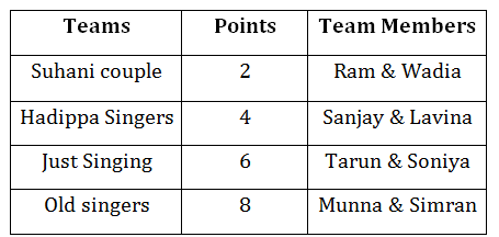 Answer 2: (D) The teams arranged in the order of points is: Suhani couple, Hadippa Singers, Just Singing, Old singers. The correct option is (D).