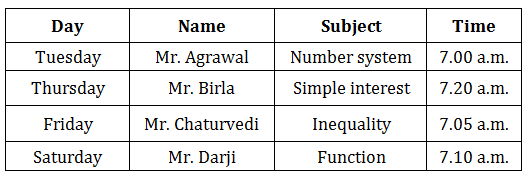 Mr. Darji didn’t teach on Friday. Simple interest was taught in the class that started at 7:20 am. Mr. Birla took the class on Thursday, but he didn’t teach Number system. The class on Tuesday started at 7:00am, but Mr. Darji didn’t teach it. Mr. Agrawal didn’t teach Inequality. Mr. Chaturvedi, who didn’t teach Function, taught a class that started five minutes later than the class featuring the teacher who taught Number system. The teacher in Saturday’s class taught Function. Thursday’s class didn’t start at 7:10 am. No two classes started at the same time.