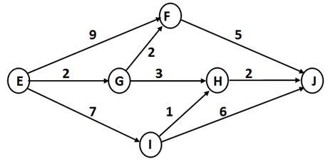 A significant amount of traffic flows from point E to point J in the one-way street network shown below. Points F, G, H and I are junctions in the network, and the arrows mark the direction of traffic flow. The fuel cost in rupees for travelling along a street is indicated by the number adjacent to the arrow representing the street.