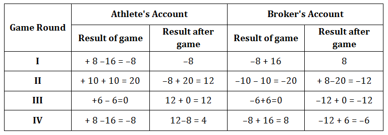 Recently, Bosch Babu spent his winter vacation on Hawaai Island. During the vacation, he visited the local casino where he came across a new card game. Two athletes, using a normal deck of 52 playing cards, play this game. One athlete is called the ‘broker’ and the other is called the ‘athlete’. First, the athlete picks a card at random from the deck. This is called the base card. The amount in rupees equal to the face value of the base card is called the base amount. The face values of ace, king, queen and jack are ten. For other cards the face value is the number on the card. Once the ‘athlete’ picks a card from the deck, the ‘broker’ pays him the base amount. Then, the ‘broker’ picks a card from the deck and this card is called the top card. If the top card is of the same suit as the base card, the ‘athlete’ pays twice the base amount to the ‘broker’. If the top card is of the same colour as the base card (but not the same suit), then the ‘athlete’ pays the base amount to the ‘broker’. If the top card happens to be of a different colour than the base card, the ‘broker’ pays the base amount to the ‘athlete’.