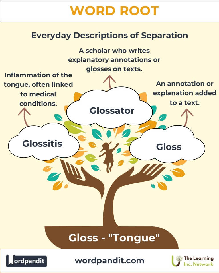 The root "gloss" originates from the Greek glōssa, meaning "tongue" or "language." It metaphorically extends to include the medium of communication, such as annotations, translations, and the study of words.
