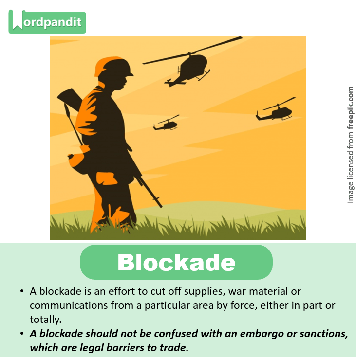 • A blockade should not be confused with an embargo or sanctions, which are legal barriers to trade.