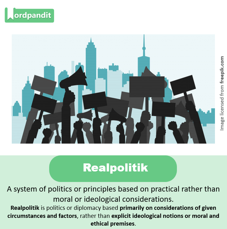 • Realpolitik is politics or diplomacy based primarily on considerations of given circumstances and factors, rather than explicit ideological notions or moral and ethical premises.
