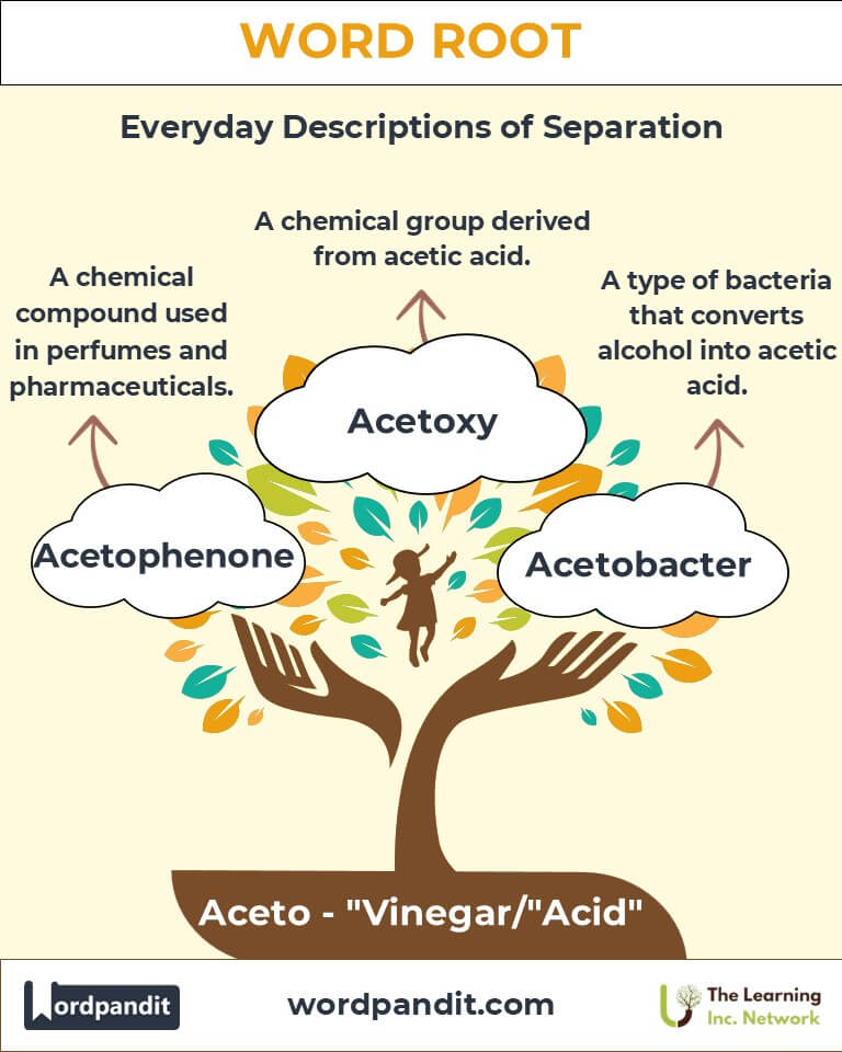 Discover the versatility of the root Aceto, derived from the Latin word acetum (meaning "vinegar" or "sour"). This root forms the basis of terms that encapsulate the essence of acidity, fermentation, and chemical reactions. From the culinary tang of vinegar to the scientific precision of acetone, Aceto plays a pivotal role in language, science, and culture.