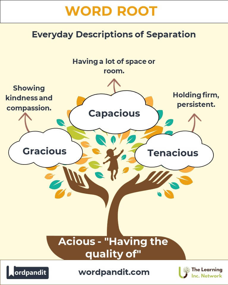 Imagine someone who is tenacious—a mountain climber gripping a rocky ledge with unyielding determination. That same climber exhibits audacity by daring to take risks. To link Acious to qualities, picture a person vividly embodying an adjective like "capacious" (having a lot of room). For Acity, think of nouns that encapsulate abstract states, like "capacity" (ability) or "velocity" (state of speed).