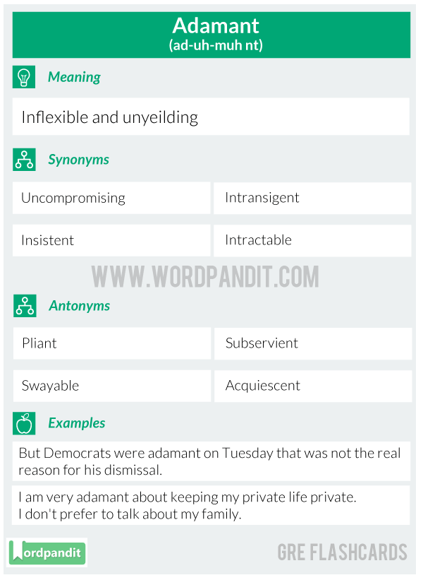 Adamant GRE Vocabulary Flashcard Previous: Acumen Next : AdmonishSubmit a Comment Cancel replyYour email address will not be published. Required fields are marked *Comment *Name * Email * Website