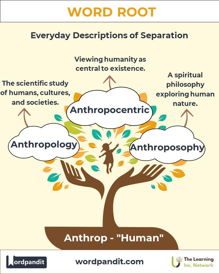 The root "Anthrop" originates from the ancient Greek "anthropos," translating to "human" or "mankind." Philosophers such as Aristotle and Plato used this term to explore human behavior and society. It entered Latin during the Roman Empire and later transitioned into English during the Renaissance. Over centuries, "Anthrop" has formed key terms reflecting humanity's evolution in thought and ethics.