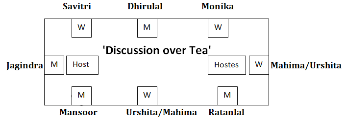 A leading newspaper decided to organize a ‘discussion over tea’ and has invited a few of the prominent figures from the field of politics. Only the two heads (one male and one female) were sitting at the opposite ends of a rectangular table, with three persons along each side. The prerequisite for the seating arrangement was that each person must be seated such that at least on one side it has a person of opposite sex. Mr. Mansoor is opposite of Mrs. Savitri, who is not the hostess. Mr. Ratanlal has a woman on his right and is sitting opposite of a woman. Miss. Monika is sitting to the hostess’s right, next to Mr. Dhirulal. One person is seated between Mrs. Mahima and Miss. Urshita, who is not the hostess. The only other person is Mr. Jagindra.