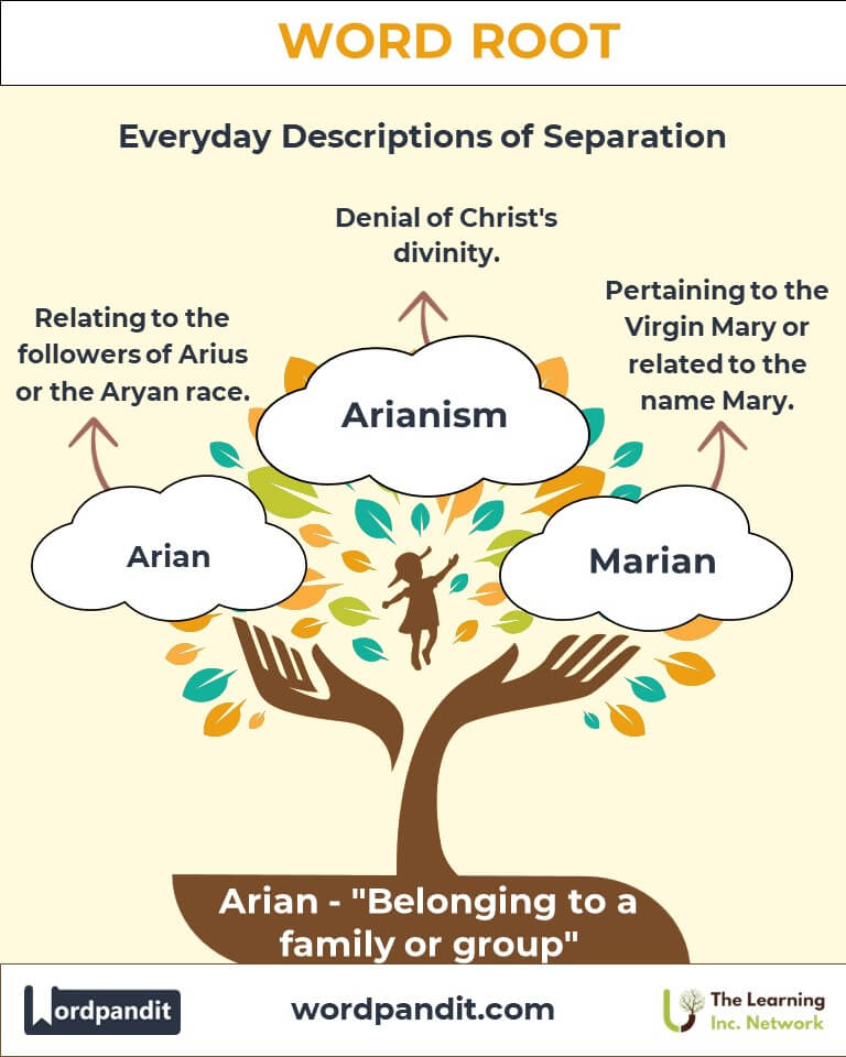 The "Arian" root evolved from the Latin -arius, initially used to form adjectives denoting relations or characteristics. As it transitioned into Old French (-arien) and eventually English (-arian), its application broadened to include nouns identifying professions and beliefs.