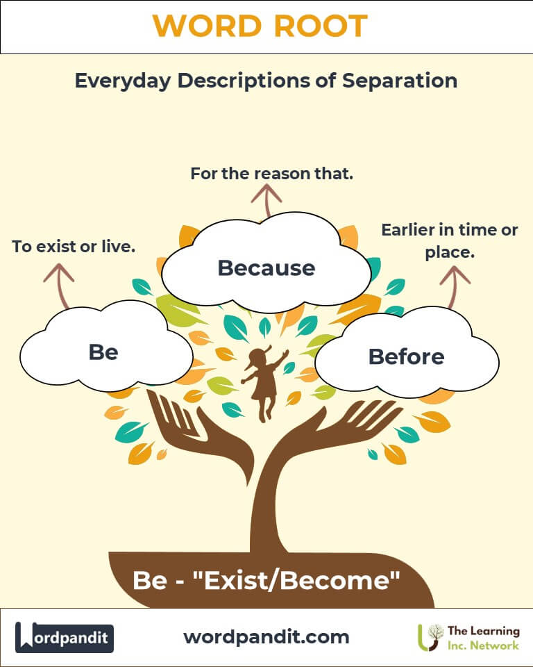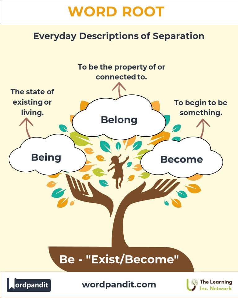 To remember "Be," think of the phrase: "Be is the beginning of being, bridging existence and expression." Visualize a bridge connecting two realms—potential and reality. The "Be" root anchors this bridge, enabling transformation and existence.