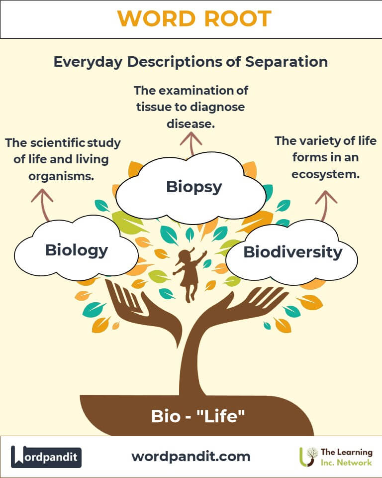 Picture a vibrant tree with roots labeled "Bio," symbolizing life and growth. The branches represent biology, biography, and biodiversity, illustrating how this root branches into various fields of knowledge.