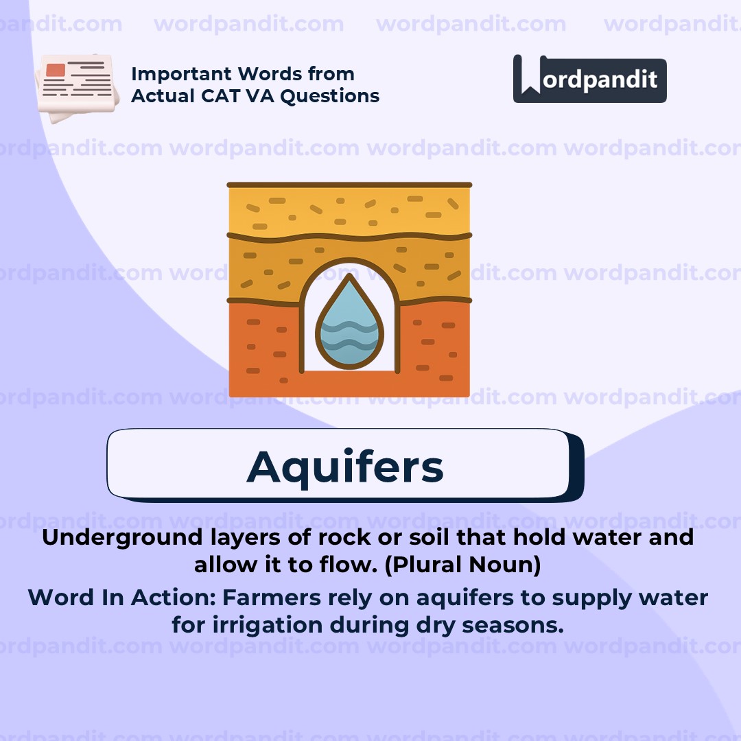 Meaning: Underground layers of rock or sediment storing water (Noun – plural)