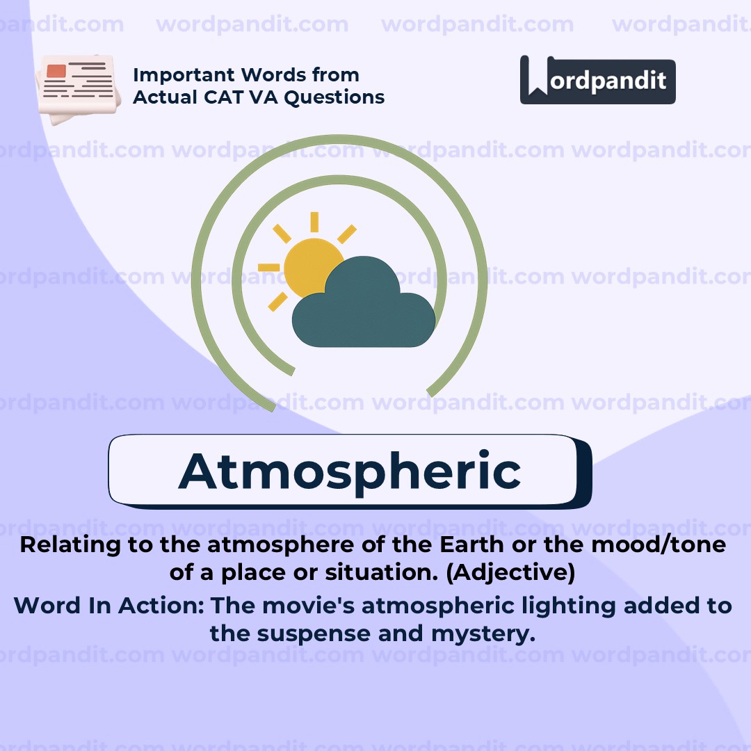Link “atmospheric” with “atmosphere”—just remember it describes anything connected to the sky, air, or surrounding mood.