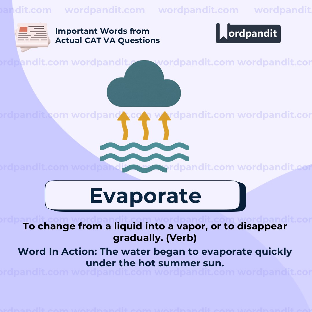 This is a key science term, especially in climate and environmental contexts. Think beyond water—money, patience, or opportunities can also metaphorically "evaporate" when they vanish quickly or silently.