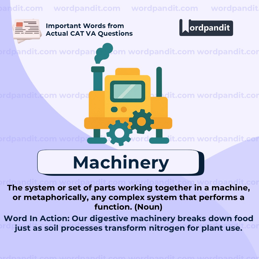 "Machinery" doesn’t always mean metal parts and gears. It can also be used figuratively to describe systems—like the body, government, or even language—that have interconnected components working together. This makes it a versatile word in both science and literature.