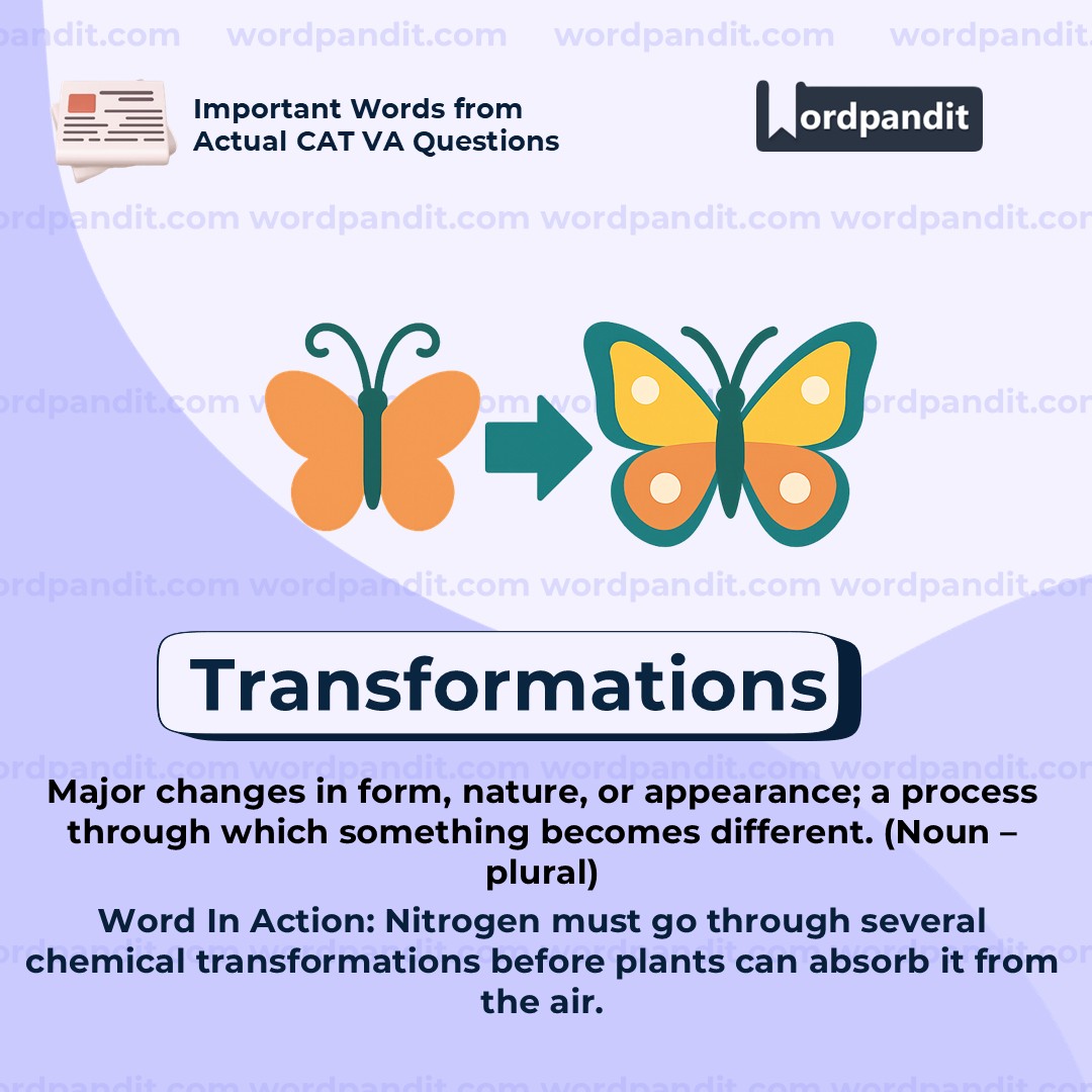 "Transformations" refers to the process of significant change or alteration, often involving a shift in form, structure, or function. In the context above, nitrogen must go through chemical and physical changes before plants can absorb it—just as food must be digested and converted into usable nutrients by our bodies. The word emphasizes a process of conversion that makes substances useful, functional, or suitable for a new purpose.