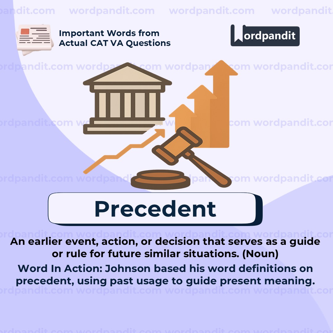 "Precedent" refers to an earlier event, action, or decision that is used as an example or guide for future situations. In this context, Johnson based his dictionary definitions not on strict rules but on how words had been used historically—much like English common law, where past rulings influence present judgments. The term suggests a respect for tradition and accumulated usage, especially in legal, academic, or linguistic contexts.