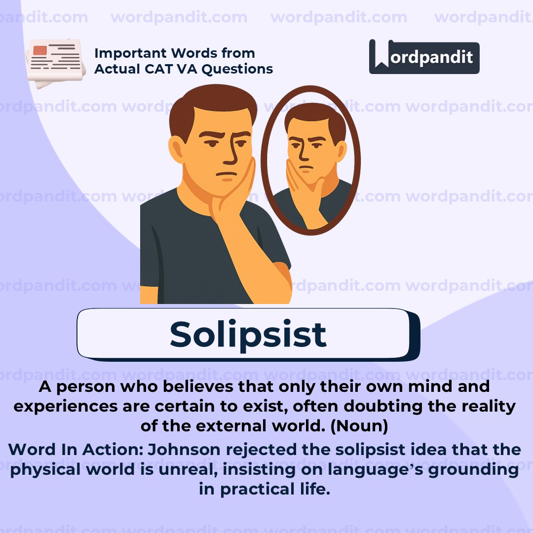 A "solipsist" is someone who believes in *solipsism*—the philosophical idea that only one's own mind is sure to exist, and everything else (including the physical world) may be just a projection of one's consciousness. In the given context, Bishop Berkeley's radical view was that material objects might not truly exist outside of perception. Samuel Johnson famously rejected this by physically kicking a rock, making a practical, physical argument against such abstract theory. The word represents a deeply self-centered or mind-only worldview, often criticized for denying the existence of external reality.