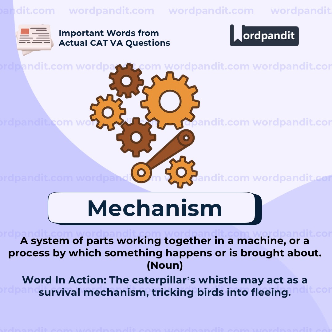 "Mechanism" refers to the system of parts or a process that makes something work or function. In the given context, it refers to how the caterpillarâs whistle works as a defense strategy. Rather than being a random sound, it's part of an evolved biological process that mimics a bird alarm call. This suggests an intentional and structured system behind what might first appear to be a simple behavior.
