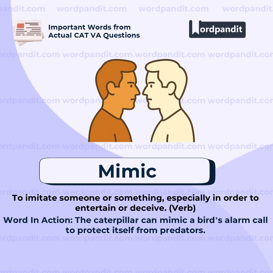 "Mimic" means to imitate or copy the behavior, sound, appearance, or voice of someone or something. In the context of the sentence, the caterpillarâs whistle is not a random noiseâit cleverly imitates the bird alarm call. This imitation serves a purpose: to confuse or scare away predators by making them think danger is nearby. "Mimic" can refer to both harmless and strategic imitation in nature or human actions.