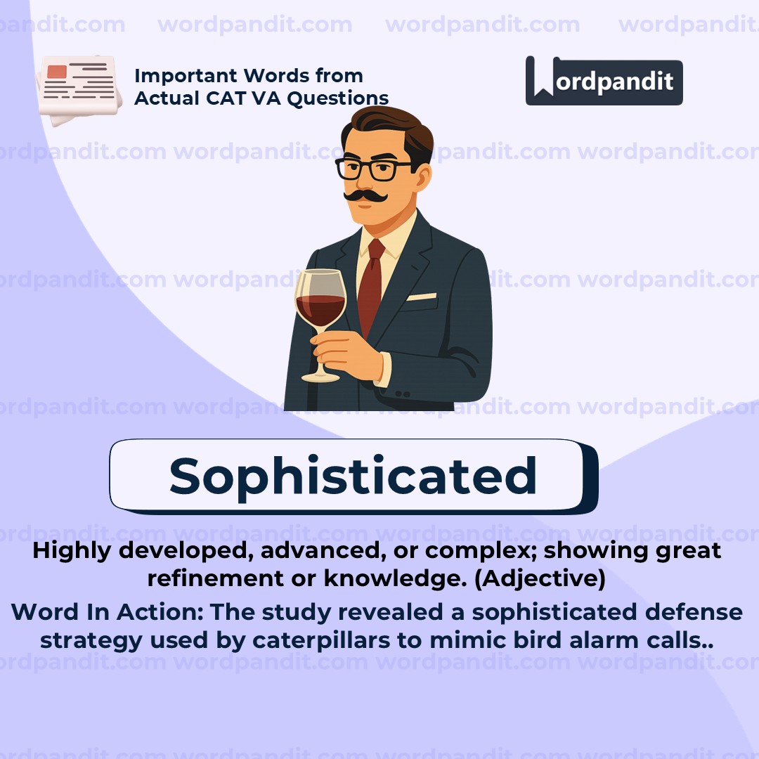 The word "sophisticated" refers to something that is complex, advanced, or developed in a refined and intricate way. In the given context, the caterpillar's defense mechanism isn't just a basic response; it's a cleverly evolved strategy that mimics a bird's alarm call, showing high biological complexity. "Sophisticated" can describe technology, behavior, or thinking that reflects depth, subtlety, or worldly experience.