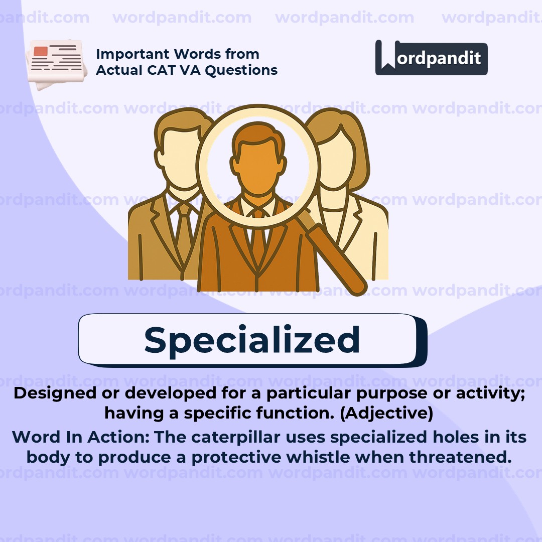 "Specialized" refers to something designed or adapted for a particular function or task. In this context, the caterpillars have evolved unique holes in their bodies specifically meant for producing a whistling sound when under attack. These holes are not genericâthey serve a highly focused defensive purpose. The word is often used to describe unique functions in biology, professions, and technology where normal systems are modified for specific roles.