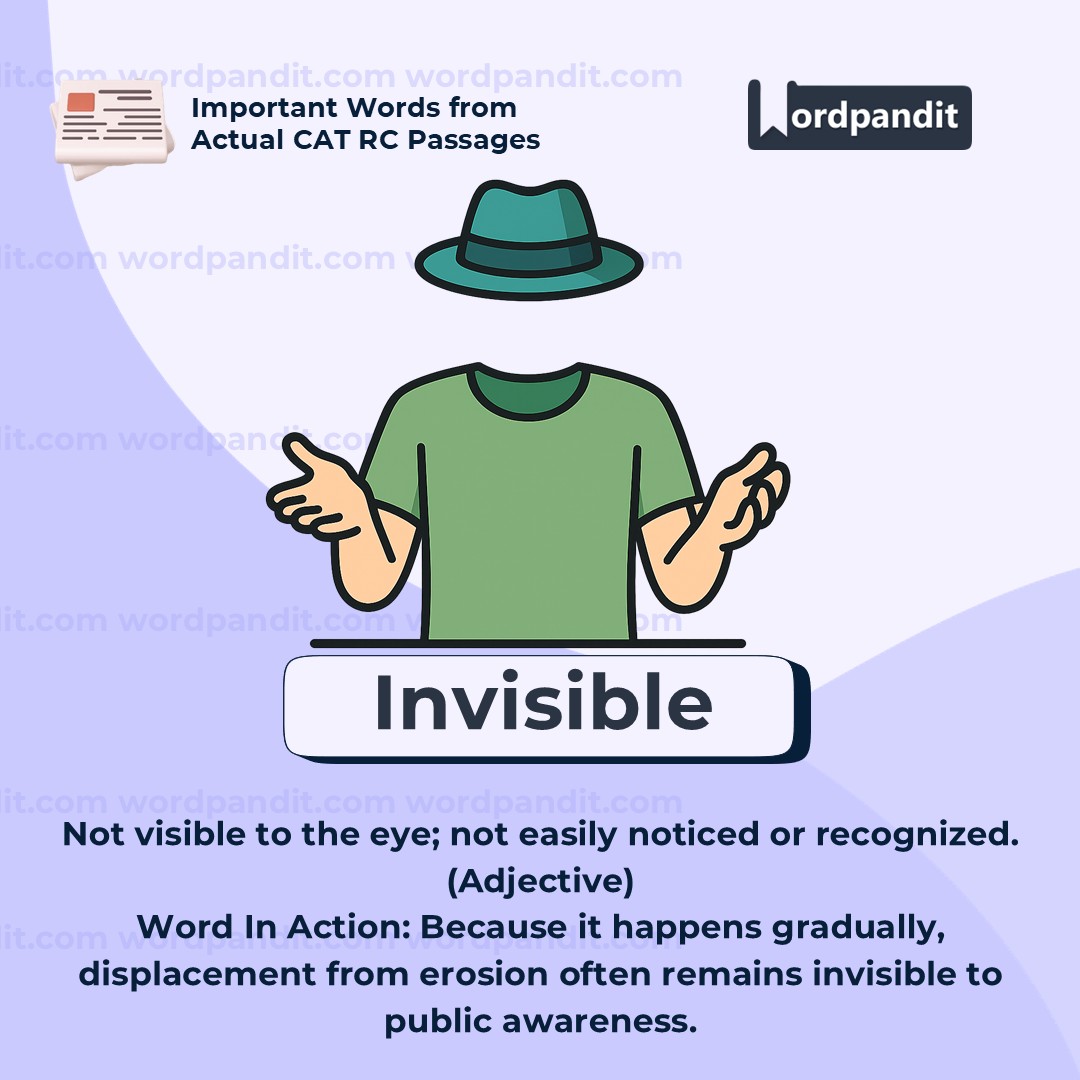 *Invisible* refers to something that cannot be seen or is not easily noticed. While it often describes things that are physically hidden from view, it can also be used metaphorically to describe problems or issues that are overlooked or ignored by society. In the sentence above, the word highlights how gradual displacement due to erosion does not attract attentionâbecause it doesnât happen suddenly or dramatically, people tend not to notice or respond to it, making the suffering of affected communities "invisible" in public discourse and policy.