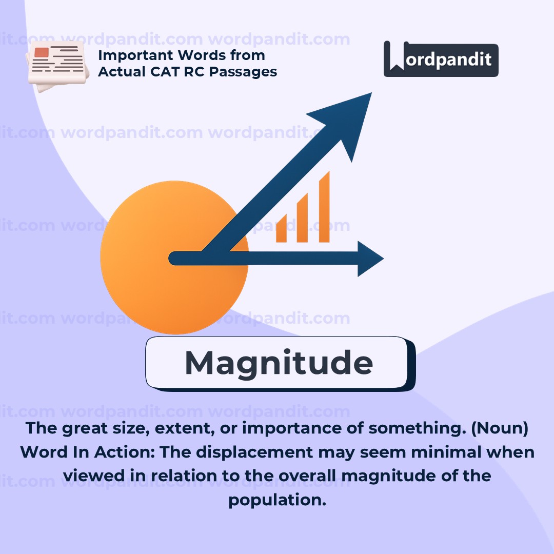 *Magnitude* refers to the size, extent, or importance of something, especially when it is large or impactful. In the sentence above, the word is used to describe the scale or degree of displacement in Bengal. It suggests that when we consider the overall size or impact (the magnitude) of displacement, it appears relatively insignificantâperhaps due to low numbers, limited geographic spread, or lesser intensity when compared to other regions or contexts.