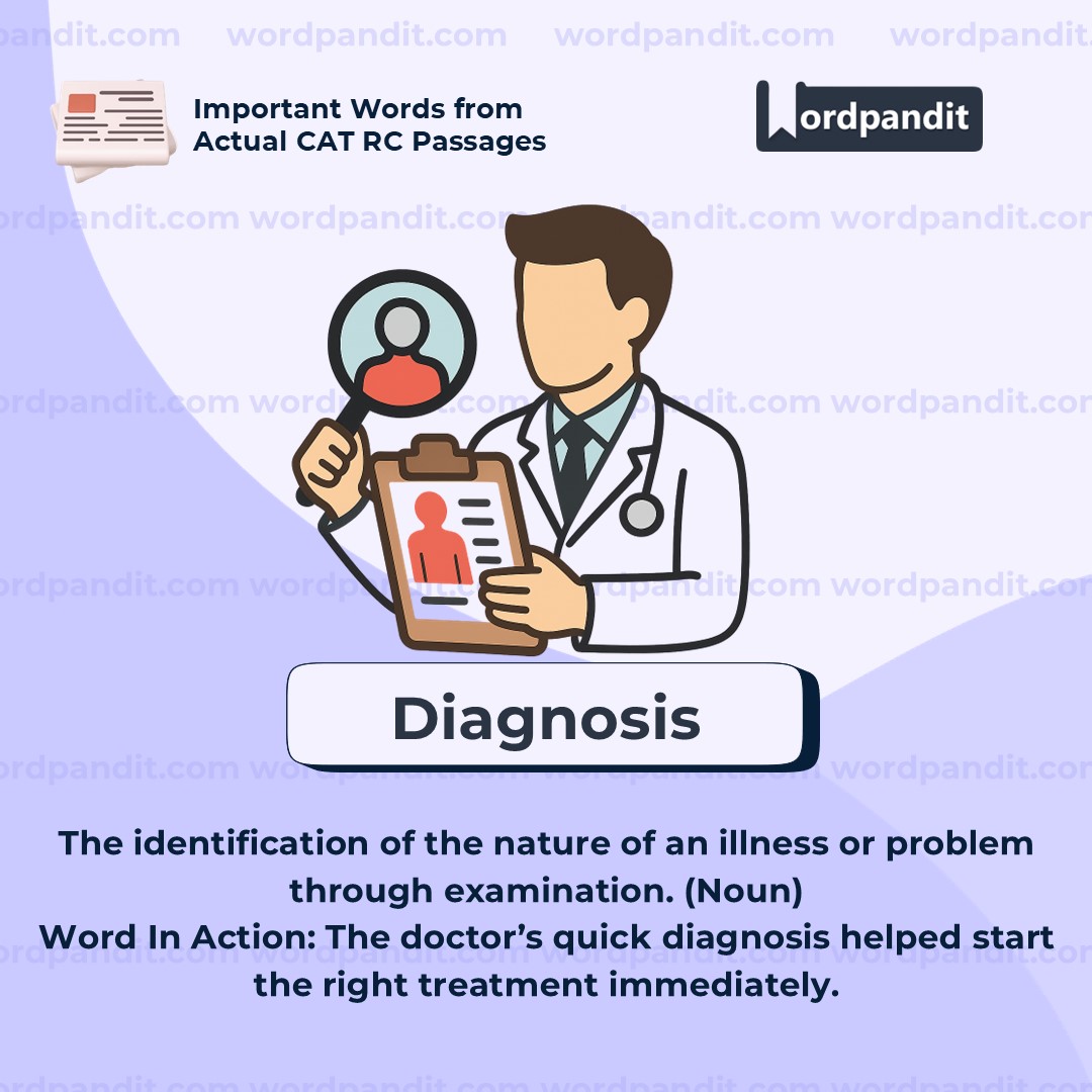Think of "diagnosis" as the doctor's detective workâobserving symptoms and clues to figure out the underlying issue. The root "gnosis" means knowledge, and "dia" means throughâso itâs âknowing throughâ observation and analysis.