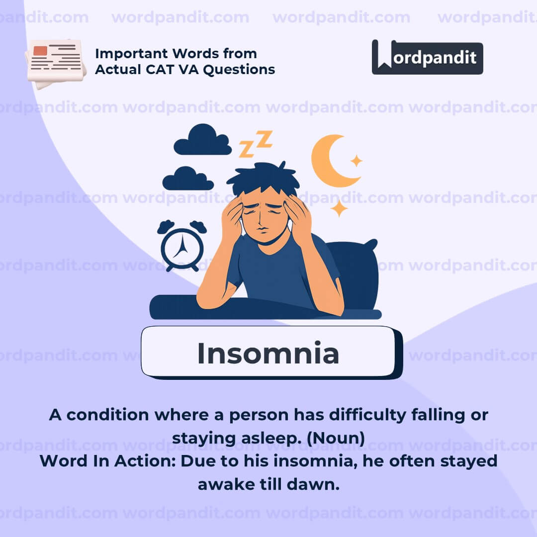 Meaning: Inability to fall asleep or stay asleep. (Noun)