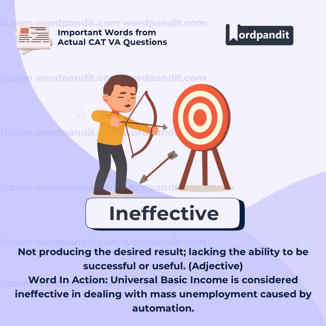 "Ineffective" means not producing the desired result or lacking the ability to achieve intended goals. In this context, the author argues that Universal Basic Income (UBI) fails to resolve the deeper issues caused by mass unemployment in a highly automated world. The word is often used to evaluate policies, strategies, efforts, or tools that fall short of expectations or impact. It carries a critical tone and suggests that something needs to be improved or replaced.