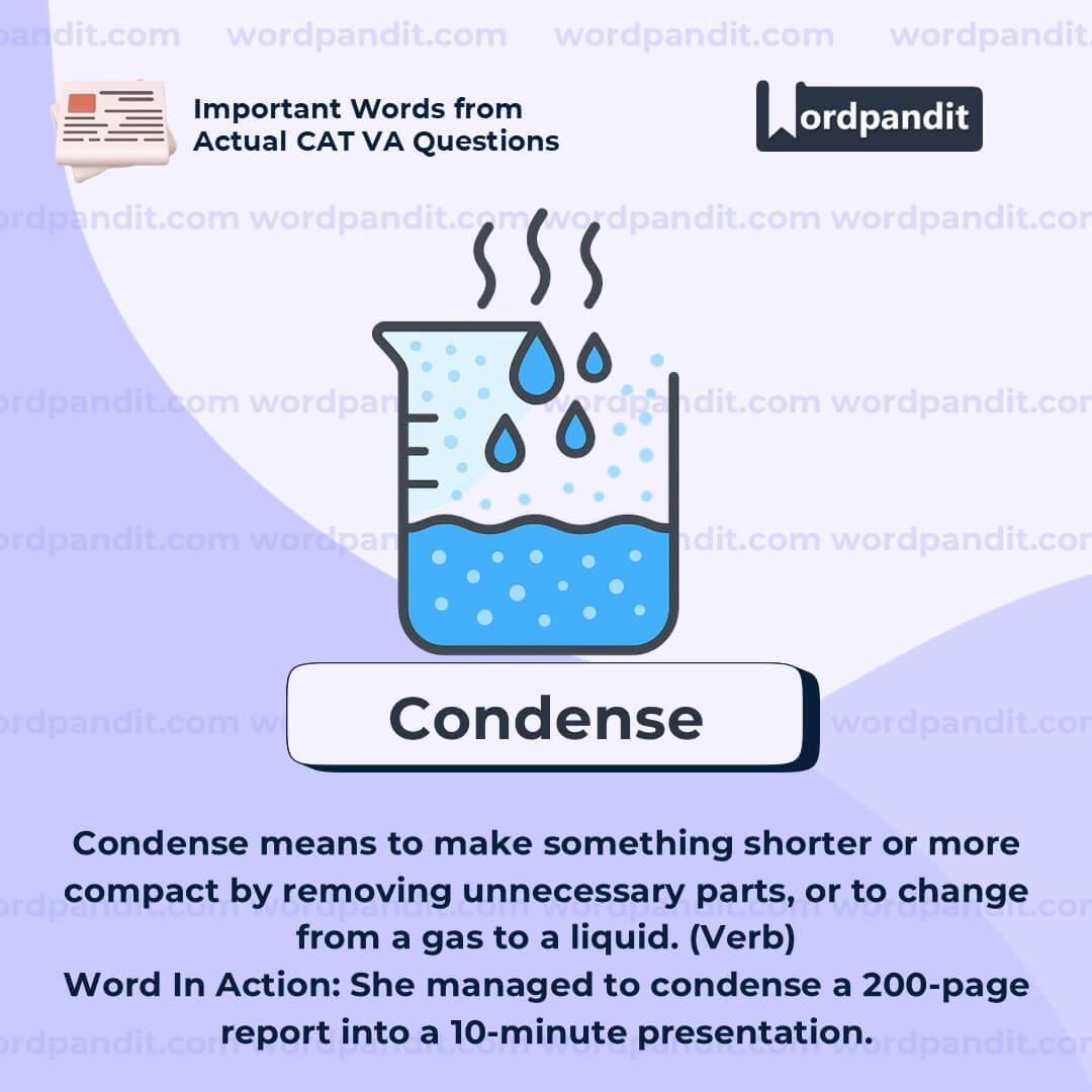 The word "condense" refers to the act of making something shorter, more compact, or more concentrated. In the context of communication or content, it means expressing the same amount of information using fewer words. Whether it’s boiling down a long message or summarizing feedback, condensing helps in increasing clarity and reducing clutter.