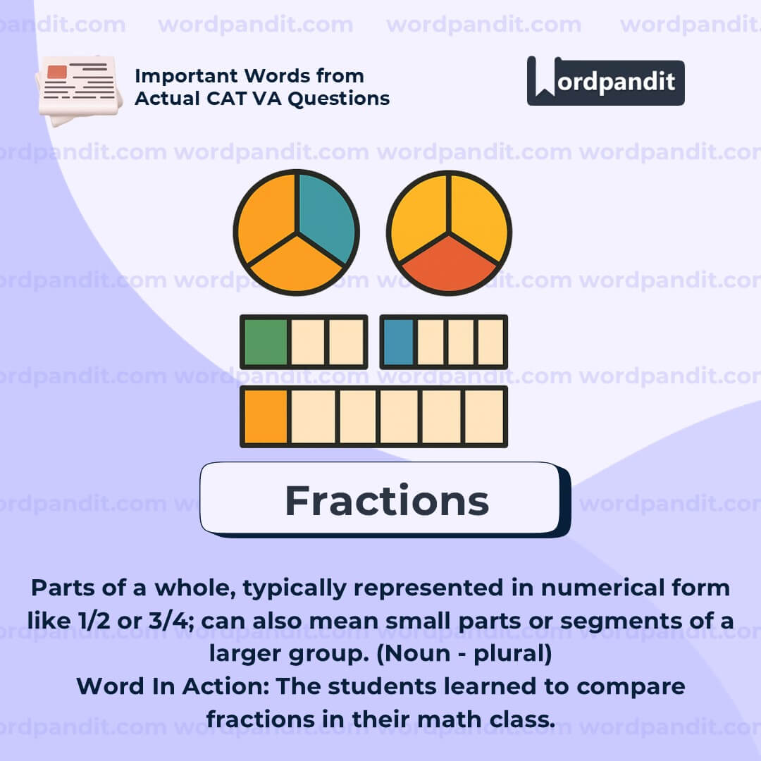 "Fractions" is a flexible word: while most students know it from math class (like ½ or ¾), it is equally useful in science and general discussion when referring to small, distinct portions of a whole.