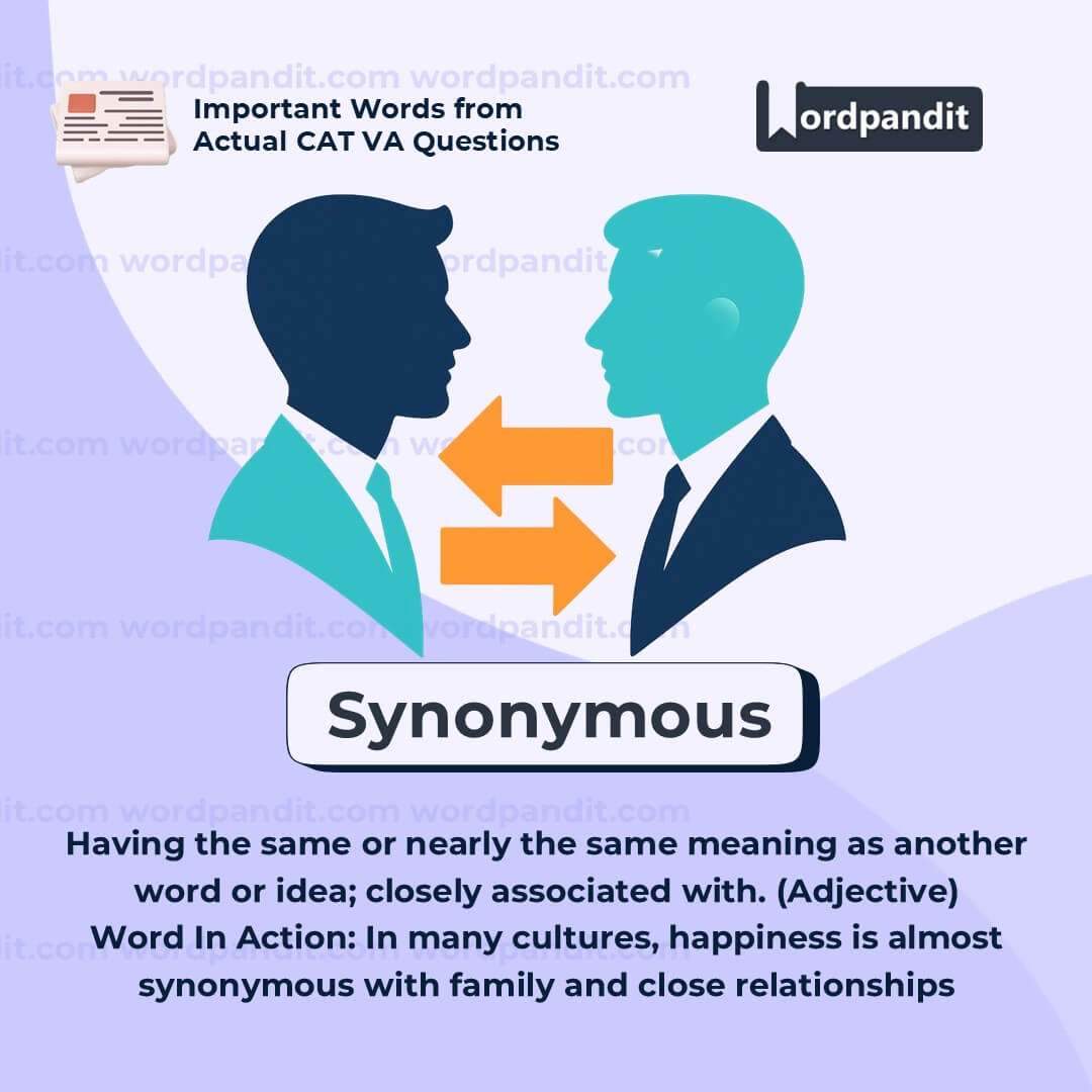 “Synonymous” sounds like “synonym” — just remember, it means 'same name' or ‘same meaning.’ If two things are synonymous, they share meaning or identity.