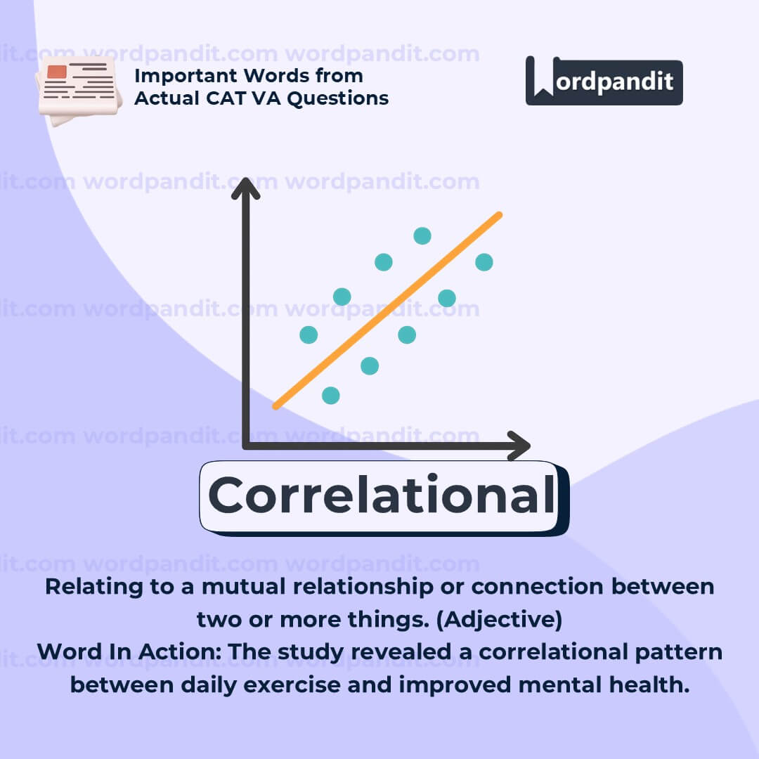 “Correlational” is a key term in research, especially in statistics, psychology, and science. Remember: correlation is not causation. Use this word when you want to show connection, not cause. It’s useful in both academic and scientific writing.