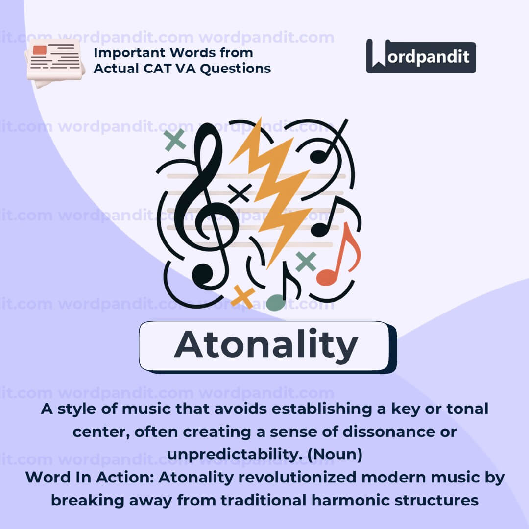 Think of “atonality” as an artistic rebellion — a conscious move away from musical norms. It helps us understand how creative evolution often starts with breaking the rules. Great for discussions in music theory, modern art, and even literature as a metaphor for structurelessness.