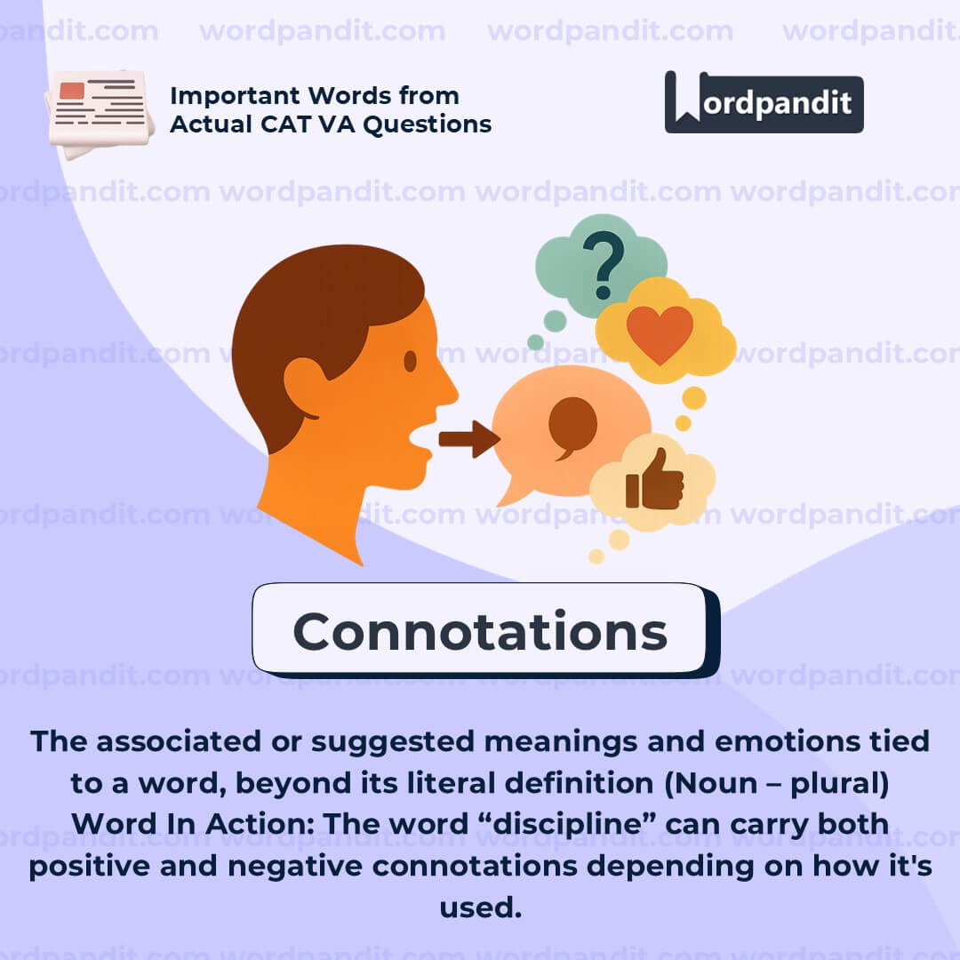 Meaning: The associated or suggested meanings and emotions tied to a word, beyond its literal definition (Noun â plural)