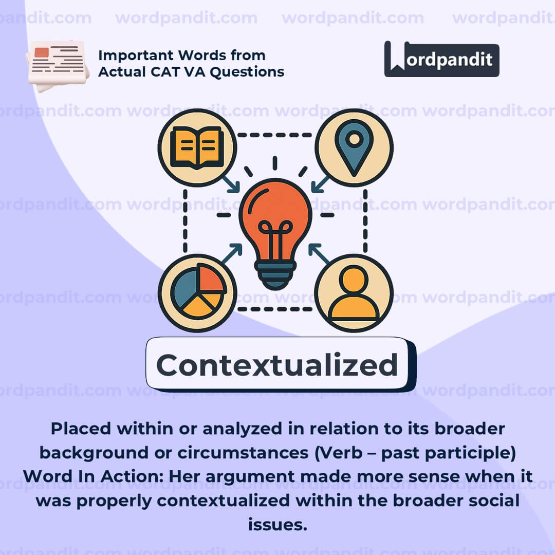 Meaning: Placed within or analyzed in relation to its broader background or circumstances (Verb â past participle)