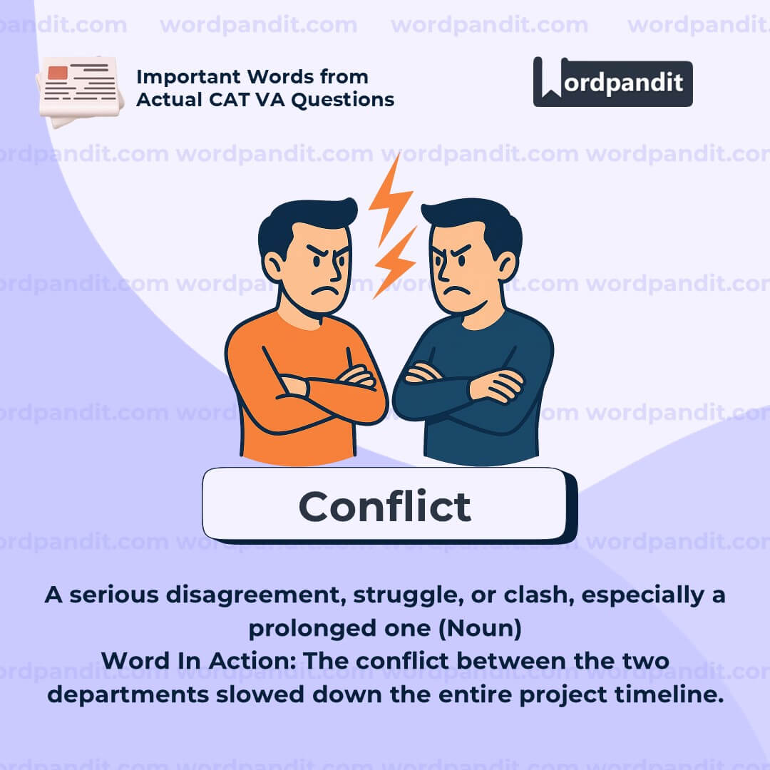 âConflictâ is a central term in political science, literature, history, and even psychology. In essays, remember to specify whether you're talking about internal conflict (within a person or country) or external (between groups or states). It's a versatile and critical academic term.