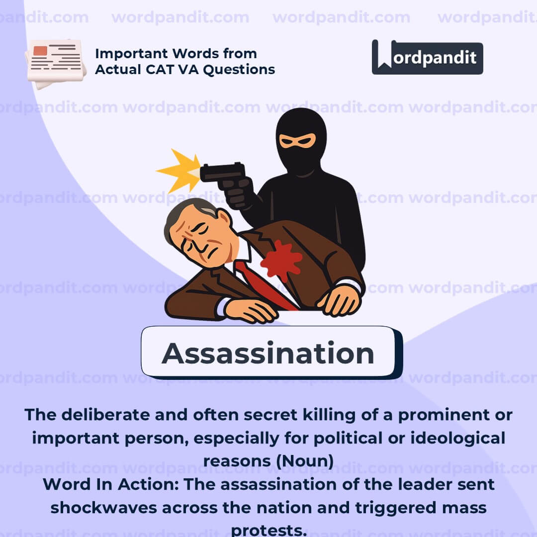 Be clear: **assassination** is more than just killingâit's political, targeted, and usually planned. Itâs a term used in history, international relations, and media. Useful in analyzing power dynamics and covert operations.