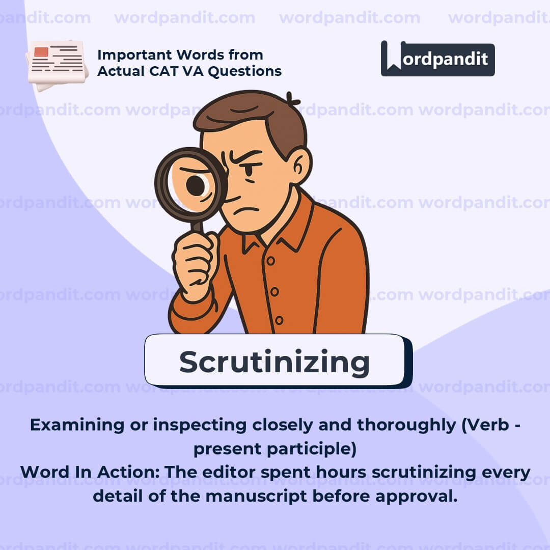 Think of “scrutinizing” as using a magnifying glass—not just seeing, but deeply investigating every detail.