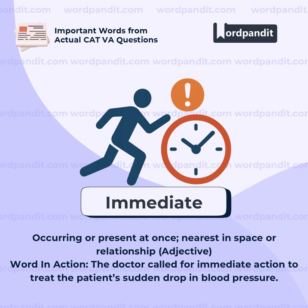 "Immediate" is used in medicine (immediate care), business (immediate action plans), everyday speech (immediate response), and psychology (immediate surroundings or reactions). It helps identify what is urgent or close by in space or time.