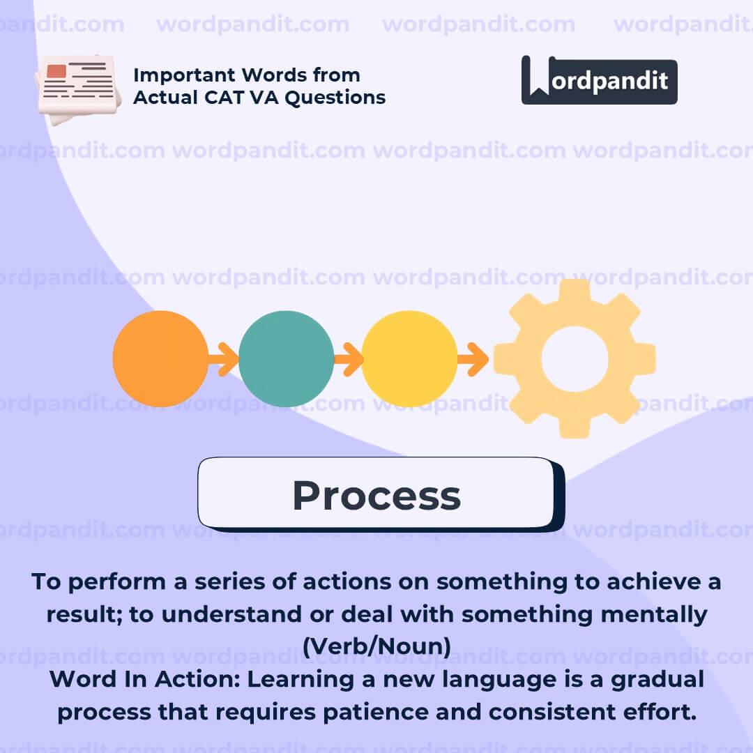 The word "process" in this context refers to the brain's act of receiving, interpreting, and understanding information. Itâs a verb that means to take in data and work through it to make sense or take action. "Process" is used across many fieldsâcomputing, psychology, business, and moreâand always relates to a sequence of actions or operations that lead to a result or outcome. Whether itâs your brain handling sensory input or a factory assembling products, to "process" means to move from input to output in a structured way.